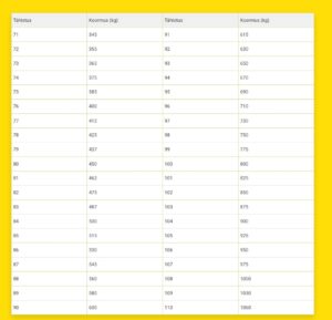 Velje laius tollides | Min rehvi laius | Ideealne sobivus | Max rehvi laius |